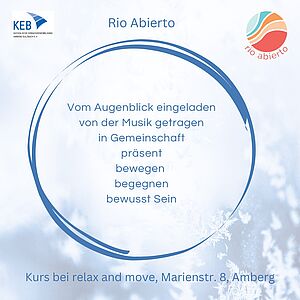 Frischen Schwung erleben in Bewegung und in Ruhe und dabei Körper, Geist und Seele durchlüften und ins Fließen bringen. Die Verbindung mit mir selbst und der Welt da draußen erkunden. Möglichkeiten finden, wie wir uns lebendiger und einfach menschlich in einer unsicheren Welt bewegen können. Unterschiedlichste Musik, die mal in angeleitete, mal in eigenständige Bewegungen mündet. Wahrnehmung von Körper und Gedanken bei der Bewegung. Sequenzen der Ruhe, des Innehaltens und der Reflexion. Ein verbindlicher Rahmen. Was ist Rio Abierto? Rio Abierto, spanisch, der "offene Fluss", ist ein Crossover zwischen Persönlichkeitsbildung und Ausdruckstanz, Wahrnehmungsschulung und Gesundheitsprävention. Bewegung zu unterschiedlichster Musik ist dabei das tragende Grundelement, denn jeder Musikstil bewegt verschiedene Körperteile.