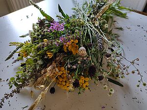 Duftende Küchenkräuter und heilsame Marienkräuter werden unter Anleitung und mit Tipps zu deren Verwendung und Wirkung zu Kräuterbüschel gebunden